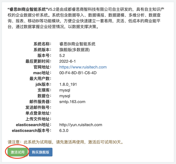 通过admin账户登录系统,在首页点击激活试用按钮,如下图: