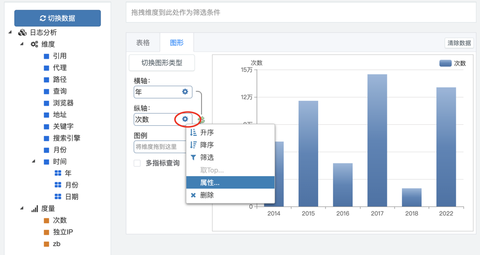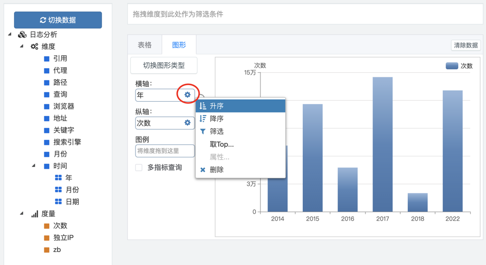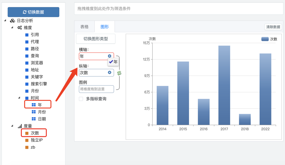 3.从数据选项卡拖拽维度到横轴或图例,拖拽度量到纵轴,系统自动刷新图形。