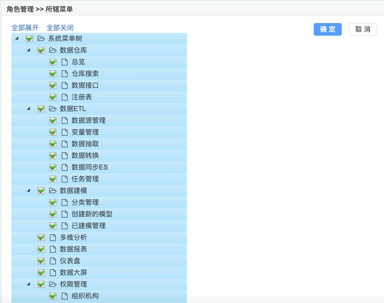 1.在角色管理页面可以对角色进行权限管理,主要包括菜单权限、表权限、报表权限、仪表盘权限等内容。
