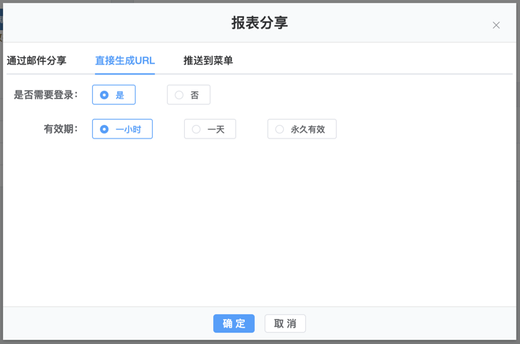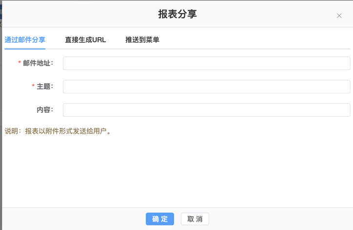 2.报表分享支持3种方式。第一种方式通过邮件发送报表给用户。填写用户邮件地址,主题,内容信息,点击确认后报表以附件形式发送给用户。