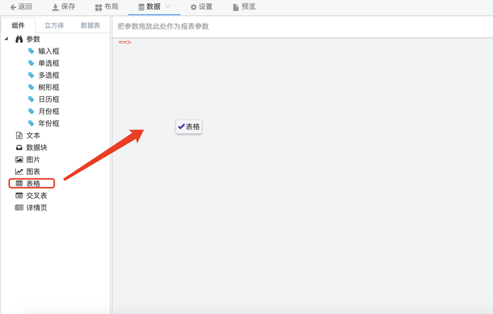 1.在报表定制界面,从组件选项卡拖拽表格到操作区。