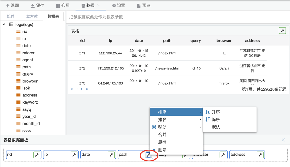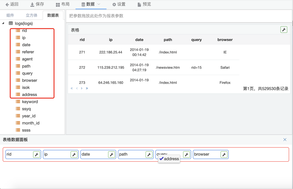 3.拖拽数据表选项卡中表字段到下发字段列表区域,表格自动刷新出数据。