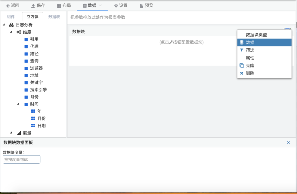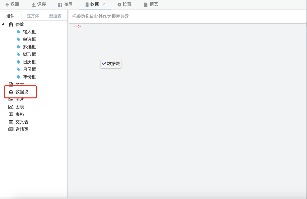 1.从组件中拖拽数据块到报表中。