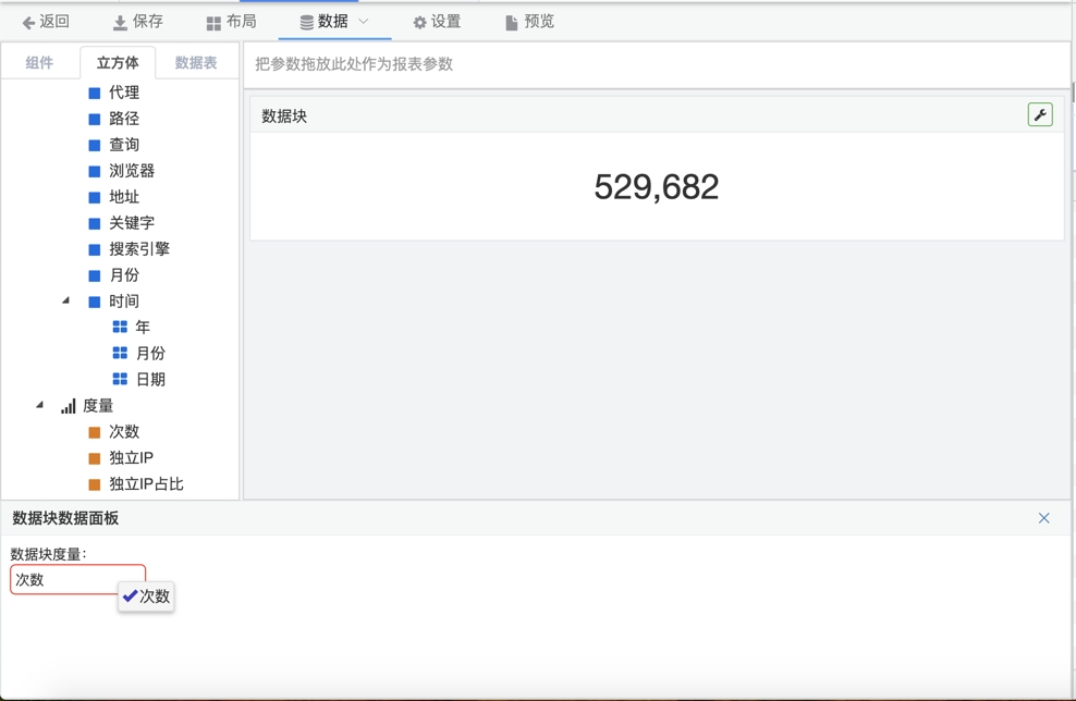 3.从立方体拖拽度量到数据面板中,系统自动刷新出度量数据。