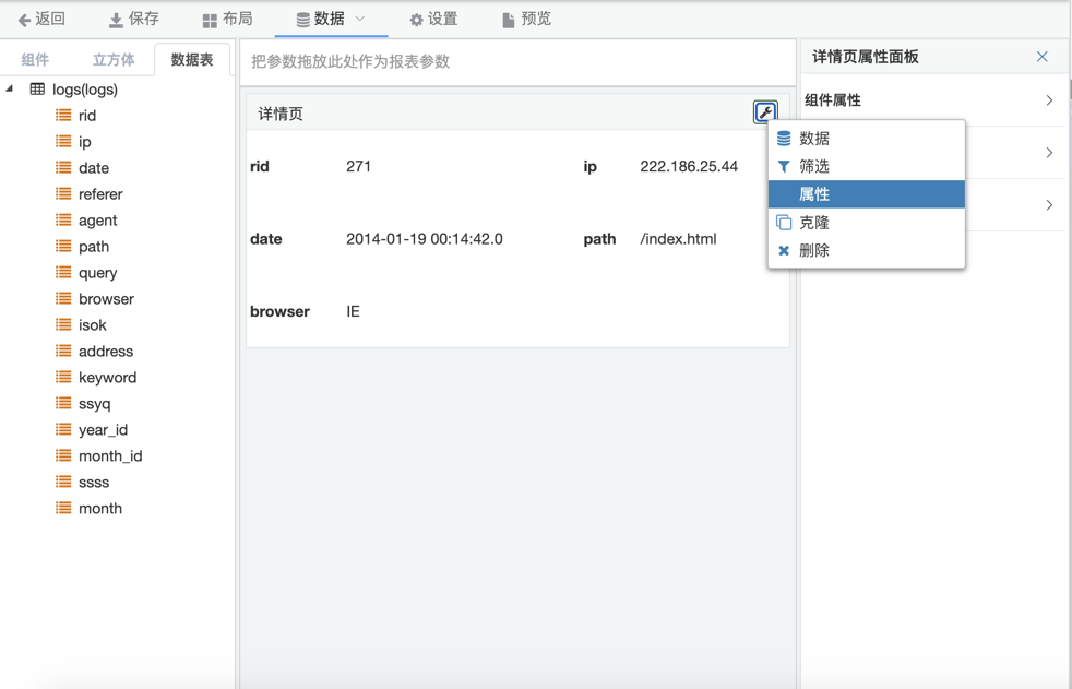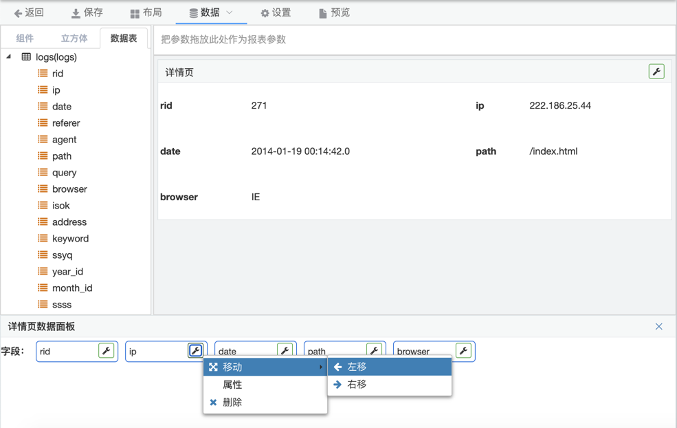 3.在详情页数据面板,点击字段右边按钮,可以对表字段进行配置,主要包括移动,属性,删除等操作,如下图: