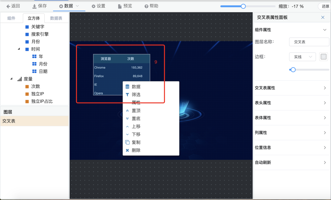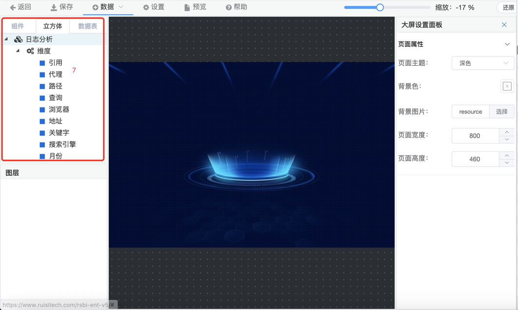 1.菜单栏,选择数据,保存大屏,设置大屏属性等操作。