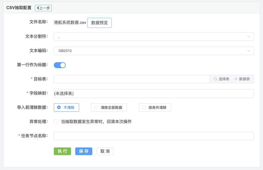2.点击上传CSV文件,上传成功后,系统进入CSV抽取配置页面,如下图: