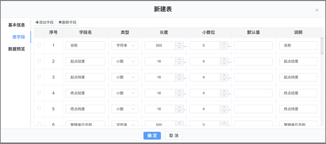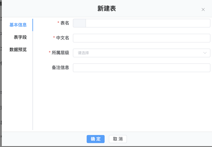 4.新建表包括基本信息、表字段、数据预览3个选项卡,在基本信息里面录入表名、中文名、所属层级等内容,点击表字段选项卡进入新建表表字段设置界面,如下图: