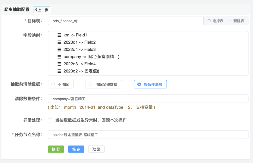 1.在数据抽取页面点击通过爬虫抽取数据菜单,系统进入爬虫定义界面,如下图:2.录入需要抓取的网页地址,设置正确的页面编码,点击解析网页按钮,系统出现表格选择选项卡,让用户选择需要解析的表格,如下图:3.选择完成后,点击下一步,进入爬虫配置页面,如下图:4.选择目标表,也可以新建目标表,来存储数据,设置字段映射内容,录入任务节点名称,点击保存按钮保存配置信息,点击执行按钮抽取数据到目标表中。