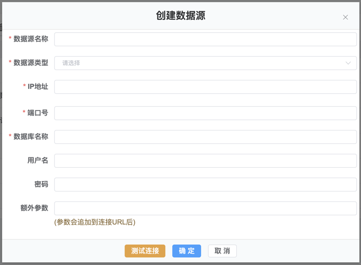 2.录入名称,选择数据源类型、录入端口、服务器地址、用户名、密码等信息,点击测试按钮,如果测试成功,点确定按钮完成数据源的创建。