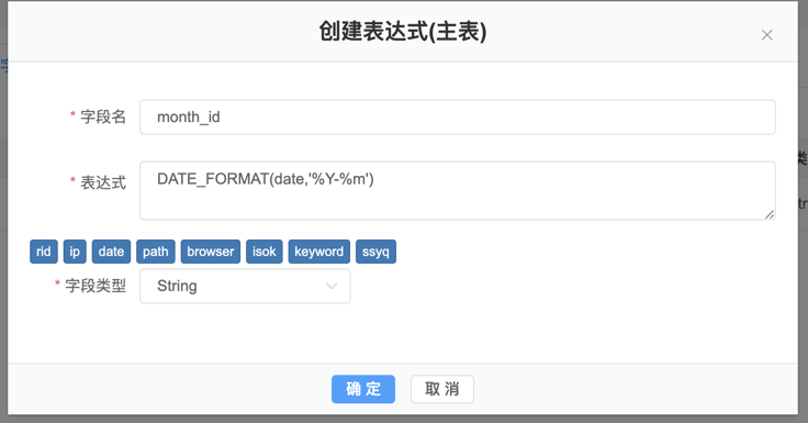 2.3) 动态字段是一个SQL片段,可以是字段转换比如: date_format(date, '%Y'),left(day_id, 4),也可以是字段运算比如:rid + 100,创建动态字段如下图: