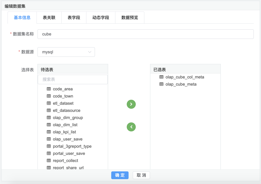 2.2)创建数据集包括选择表,建立表关联等操作,如果只选择了一个表,不用建关联。