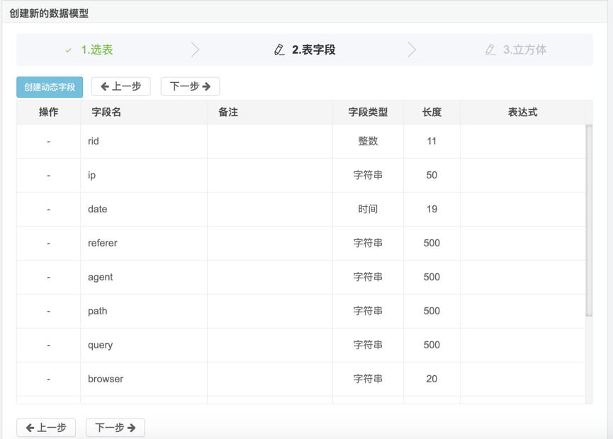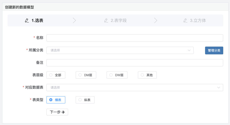 2.录入模型名称、选择分类、选择对应的数据表,点击下一步进入表字段列表页面。