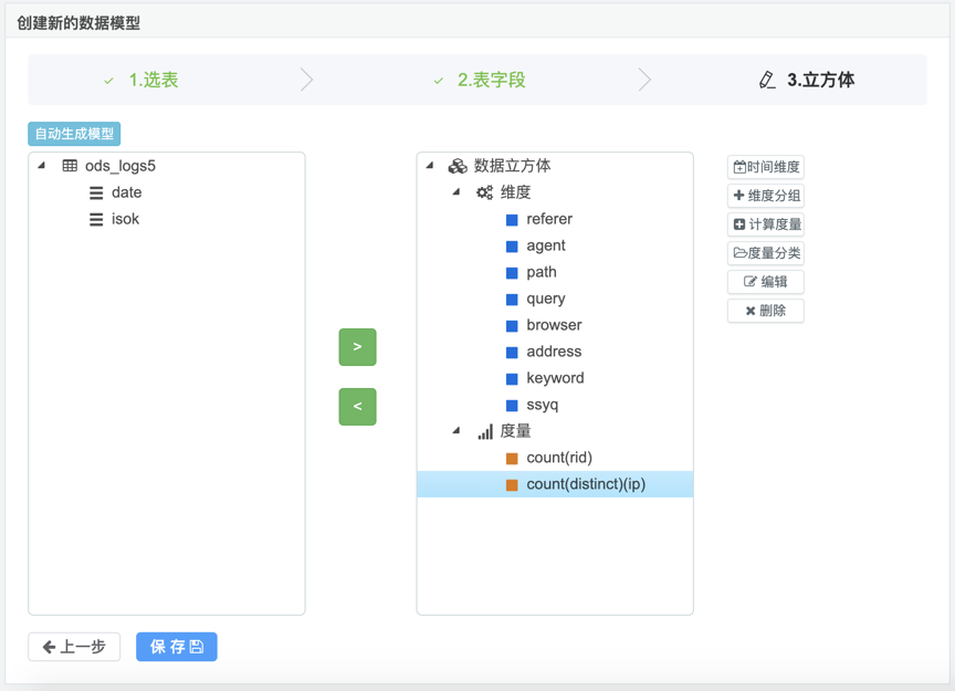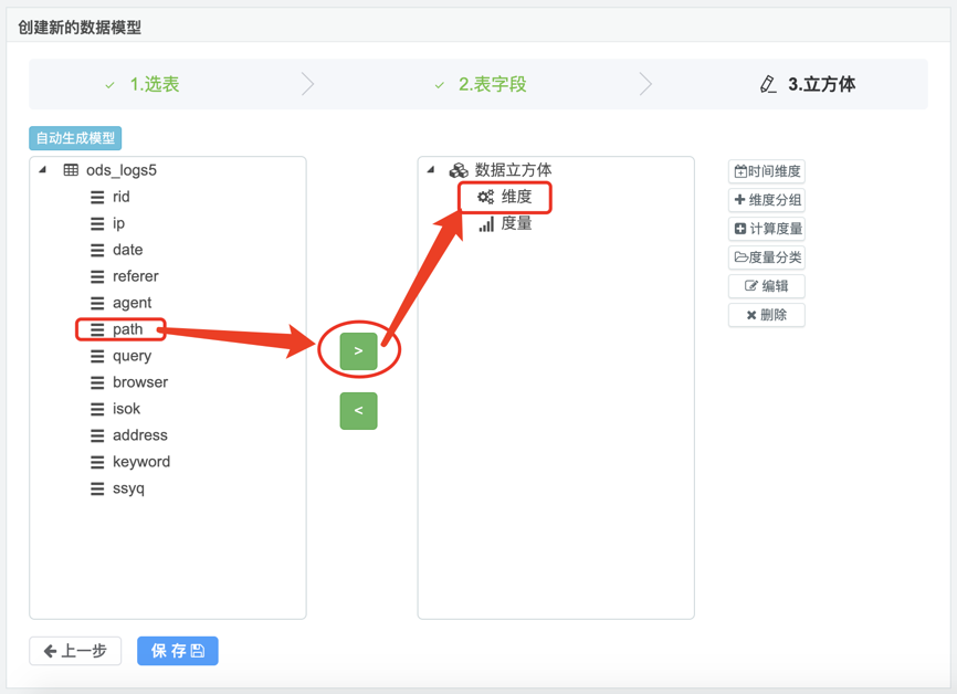6.从待选字段选择字段,从维度和度量里选择维度或度量,点击**>**按钮完成选择。效果如下