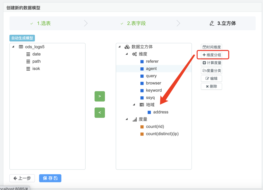 7.分组是维度是分类层次,比如时间维度可以分层为:年、月、日。点击右上角**+分组**按钮创建时间分组。