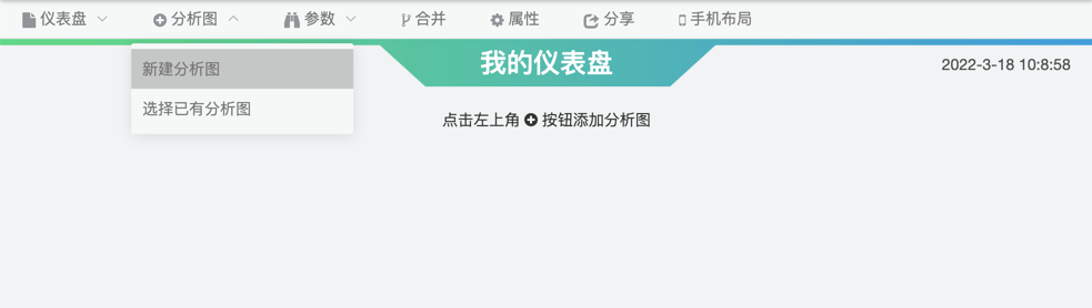 1。仪表盘由分析图构成,在仪表盘页面,点击菜单栏分析图-新建分析图按钮来创建一个新的分析图。