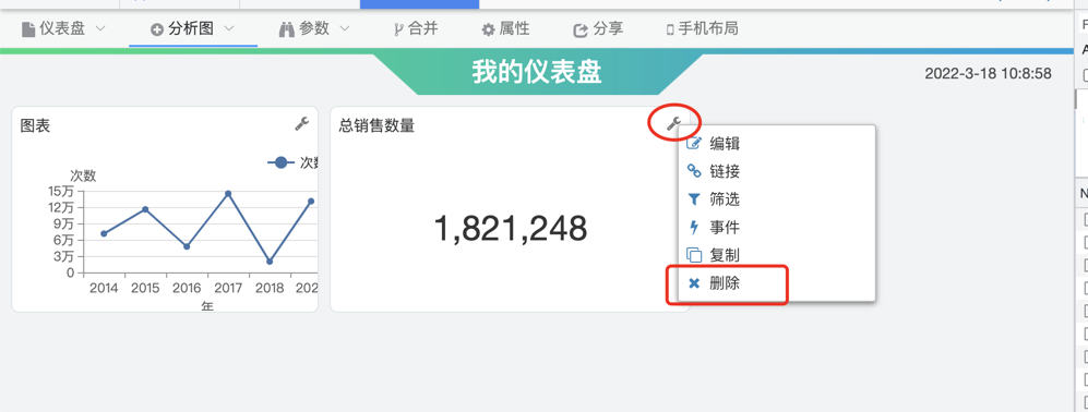 4.在仪表盘定制页面,点击删除按钮,直接删除已经存在的仪表盘,如下图: