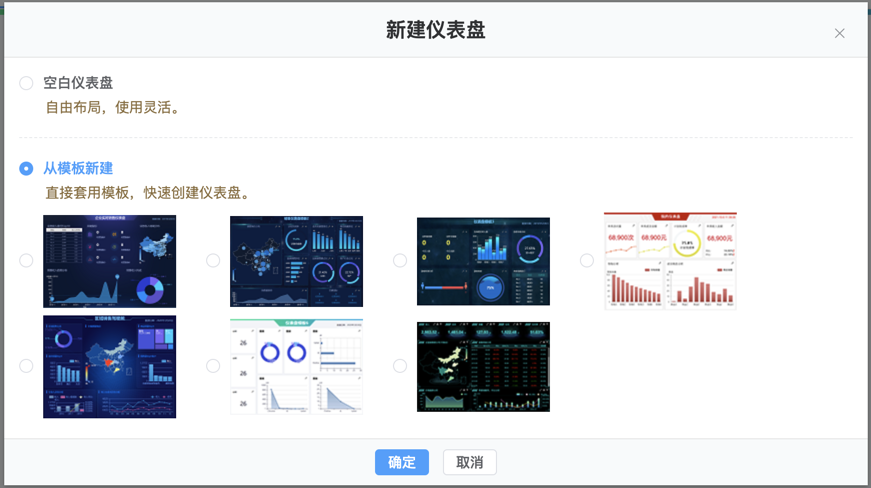 2.选择从模板新建选项卡,选择模板,点击确定按钮,模板即被自动加载到仪表盘,如下图