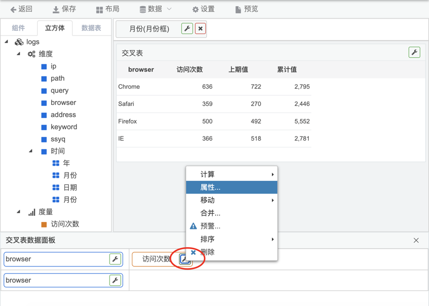 1.在交叉表的度量上点击右边扳手按钮,选择属性菜单,如下图: