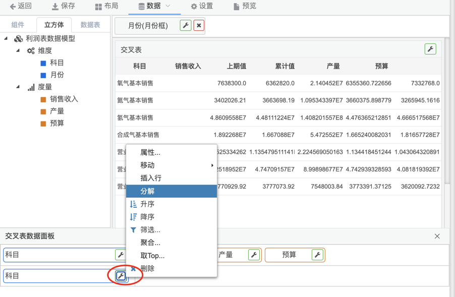 1.在交叉表需要计算的维度上点击分解按钮,把维度分解为具体的值,如下图: