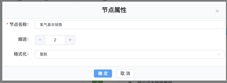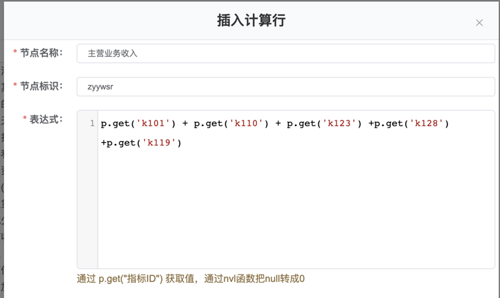 4.其中主营业务收入的计算方式为 p.get('k101') + p.get('k110') + p.get('k123') +p.get('k128') +p.get('k119'),节点名称是指新生成的指标的名称,节点标志是指新生成指标的ID,设置完成后,点击确定按钮完成创建。
