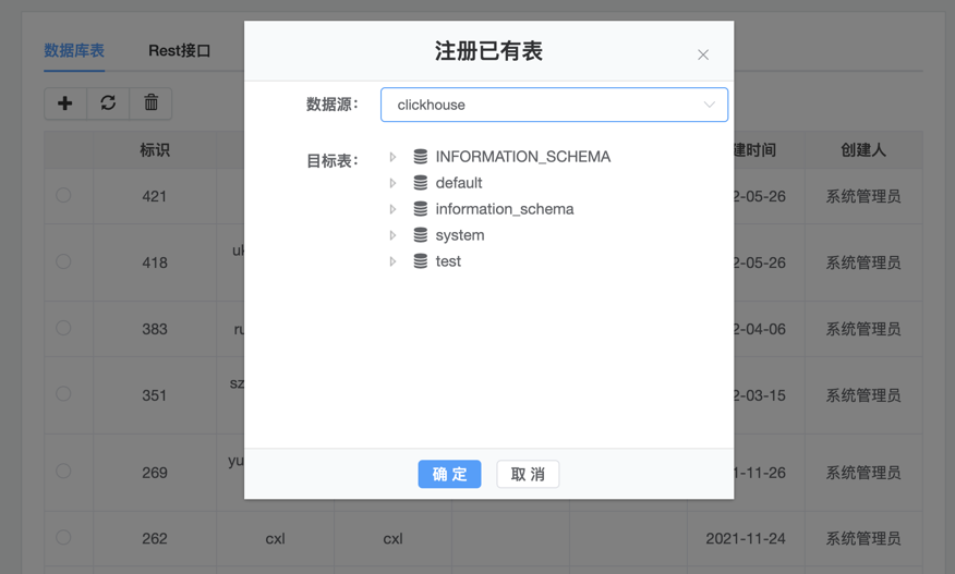 2.注册clickhouse中的表,点击注册已有表菜单,点击+号注册表,然后选择刚才创建的Clickhouse数据源,选择需要注册的表,如下图: