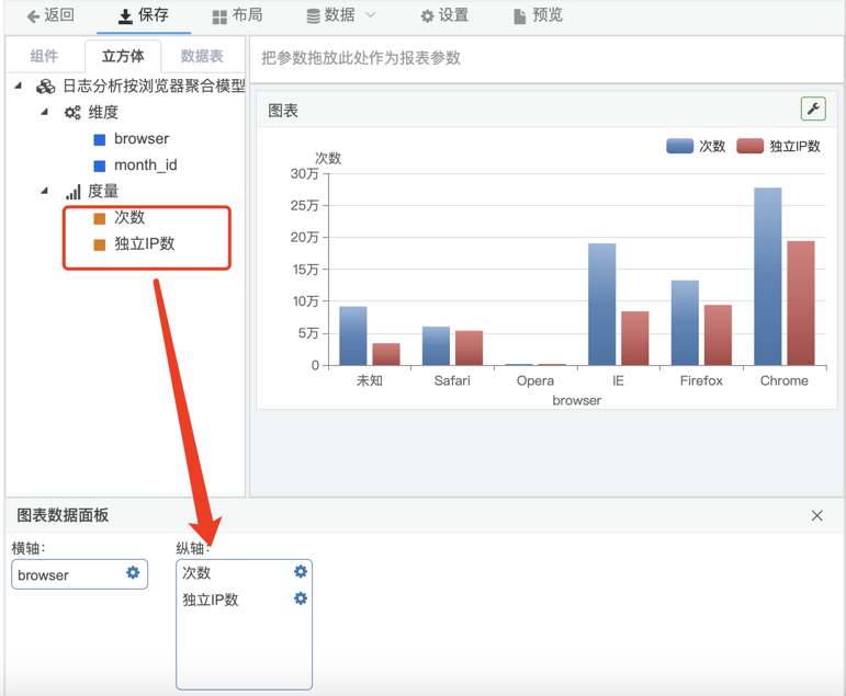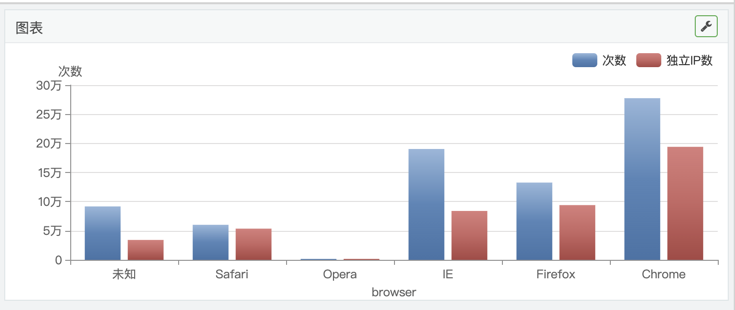 在这张图中,同时显示了次数/独立IP数两个指标。目前支持多指标的图形主要包括:曲线图、柱状图、条形图、面积图、雷达图等类型图形,制作过程如下: