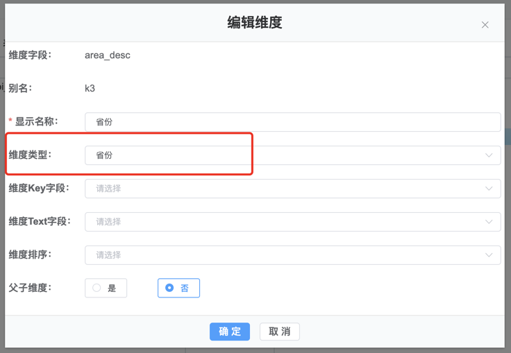1.在数据建模页面,定位维度类型未省份/地市/区县类型,如下图: