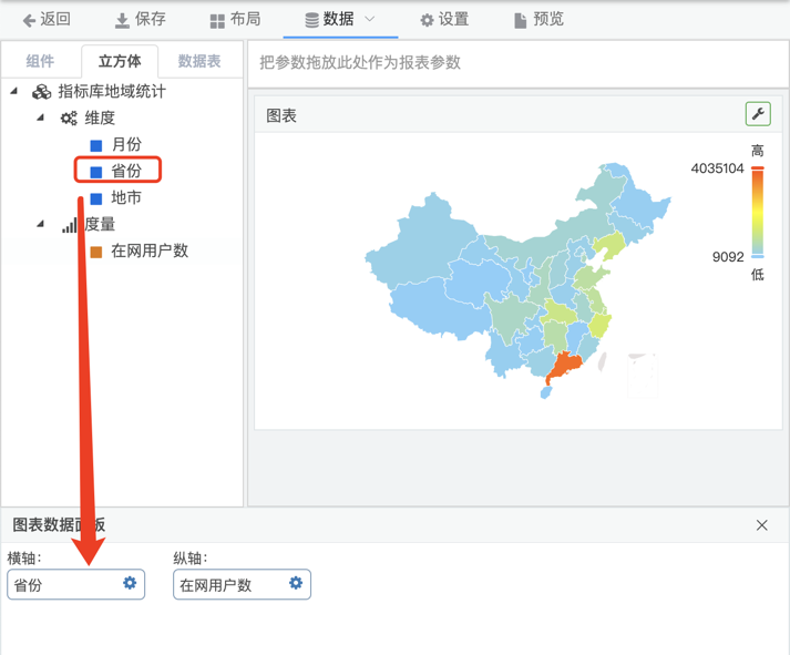 3.点击数据菜单,选择刚才创建的带地域维度的立方体,拖拽地域维度到横轴,度量到纵轴,如下图: