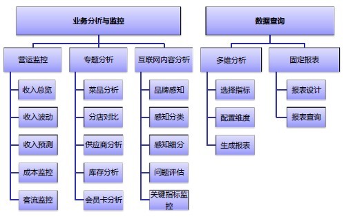 上线公司为一家餐饮连锁企业,有近20家连锁店。企业已经上线了点菜收银系统,供应链管理系统,会员卡管理系统,有一定的历史数据沉淀,但业务数据混乱,各系统数据分析功能较弱,难以满足管理者分析数据的需求。